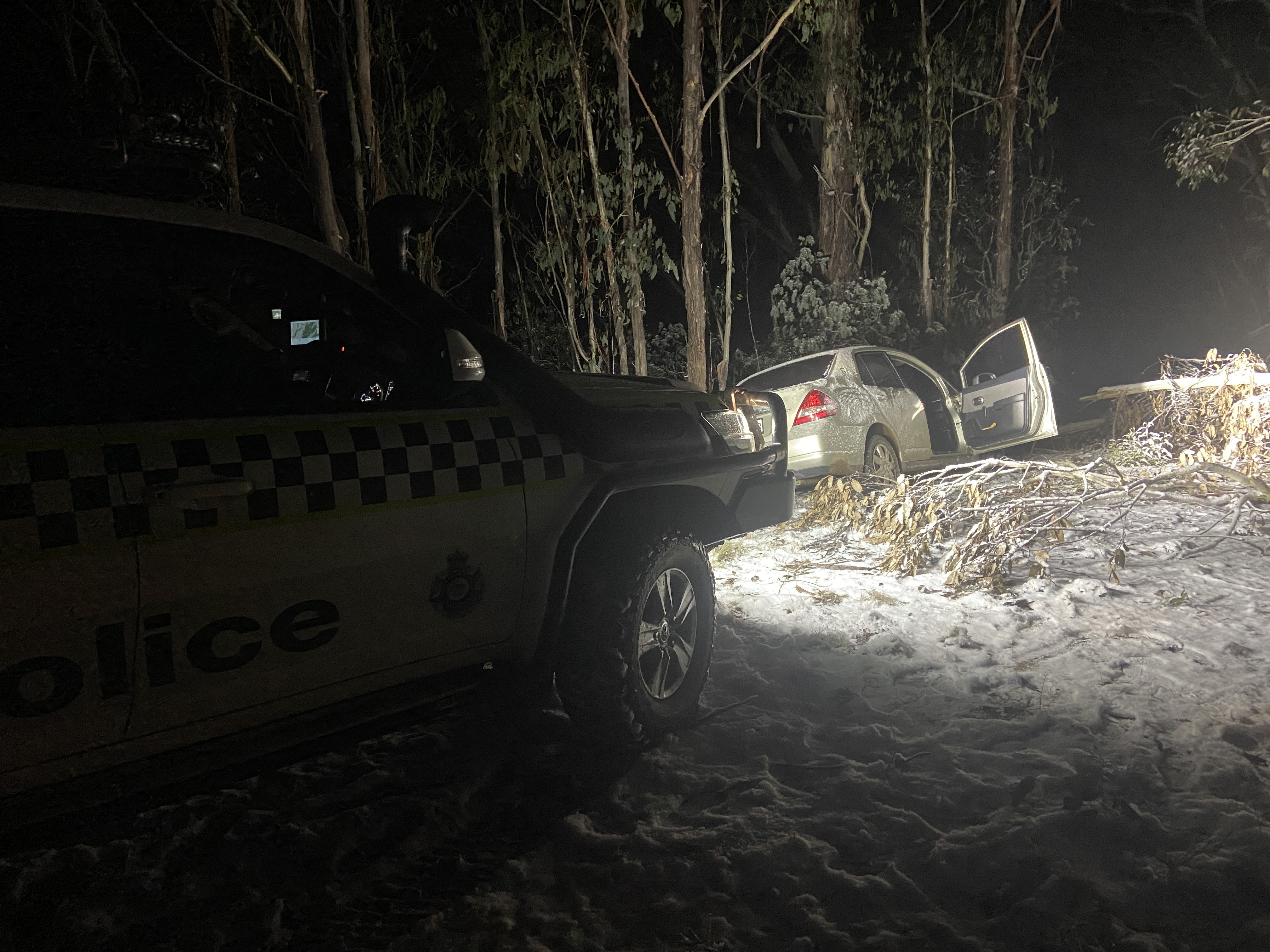 About 7pm on Sunday, 28 July 2024, police rural patrol observed a two-wheel drive sedan that had become bogged in snow after coming across a felled tree blocking a trail. A 21-year-old man in the vehicle advised his 22-year-old friend had left on foot to flag down assistance from members of the public.