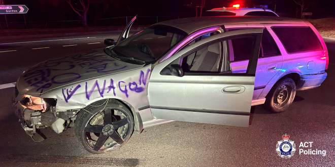 Shortly after 10:30pm on Saturday, NSW Police observed a silver Ford wagon (that had words spray painted on it and was in poor repair) driving dangerously through Queanbeyan. The vehicle failed to stop for NSW Police before entering the ACT where it was observed driving at excessive speed through multiple suburbs.
