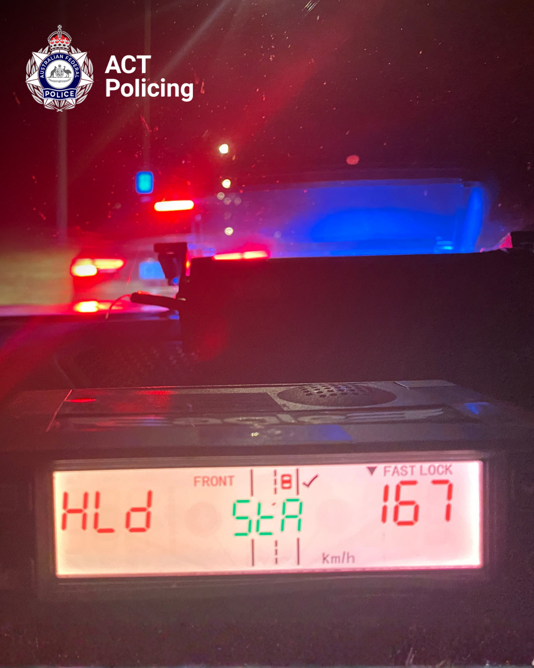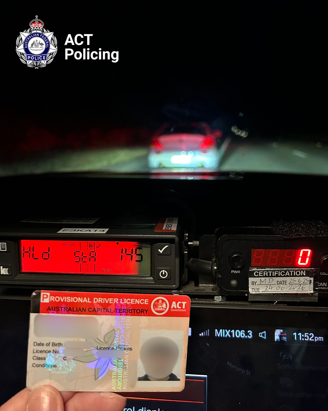 About 11:45pm on Saturday (8 November 2025), police detected a 19-year-old Macgregor man driving a Hyundai Tiburon on William Hovell Drive in Hawker doing 145km/h in a 90km/h signposted zone.