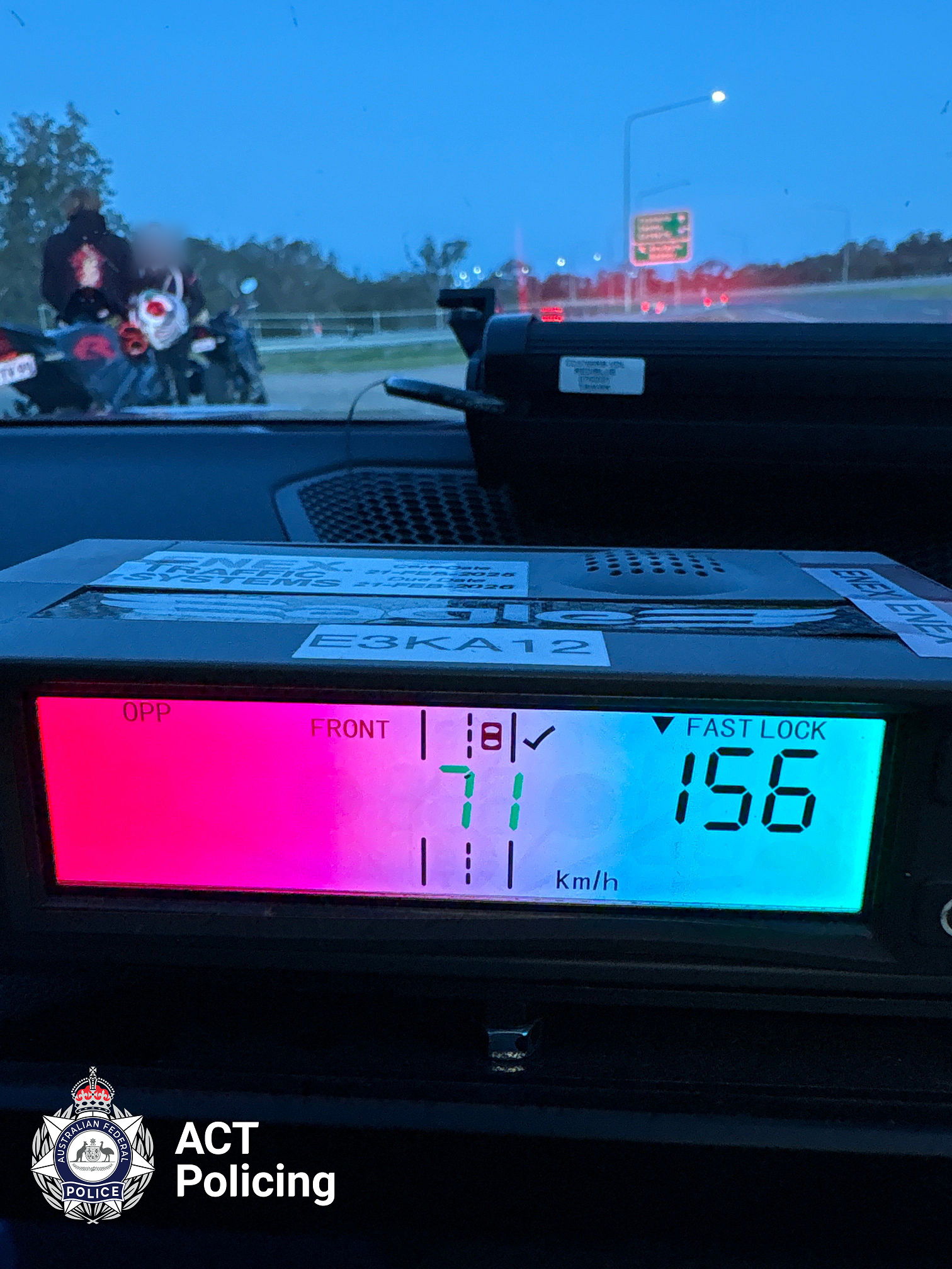 In a separate incident, at 7:10pm last night, police observed a motorcycle travelling at 156km/h in a signposted 80km/h zone on Horse Park Drive in Kenny.